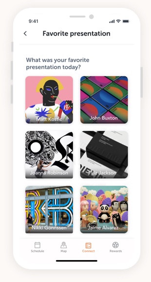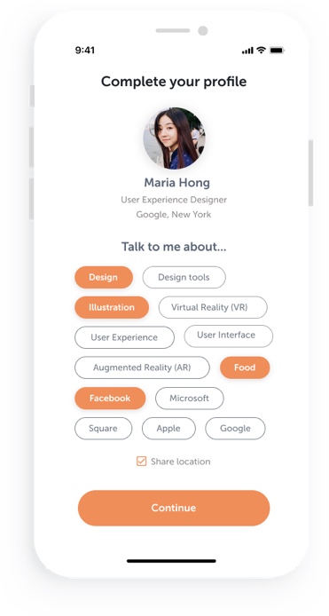 Once they sign-in, users can choose their interests at the conference. The profile can be updated at point as it will always be accessible across the app. There will be certain options of preferences so the user won’t feel the pressure of filling personal information.